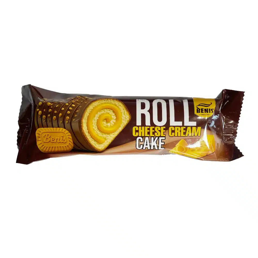 کیک رولی با کرم پنیری و روکش فرآورده کاکائویی و بیسکویتی بنیس حجم ۵۰ گرم
